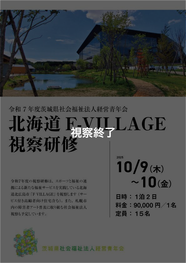 令和7年度の視察研修は、スポーツと福祉の連携による新たな福祉サービスを実践している北海道北広島市「F VILLAGE」を視察します(サービス付き高齢者向け住宅含む)。また、札幌市内の障害者アート普及に取り組む社会福祉法人視察も予定。