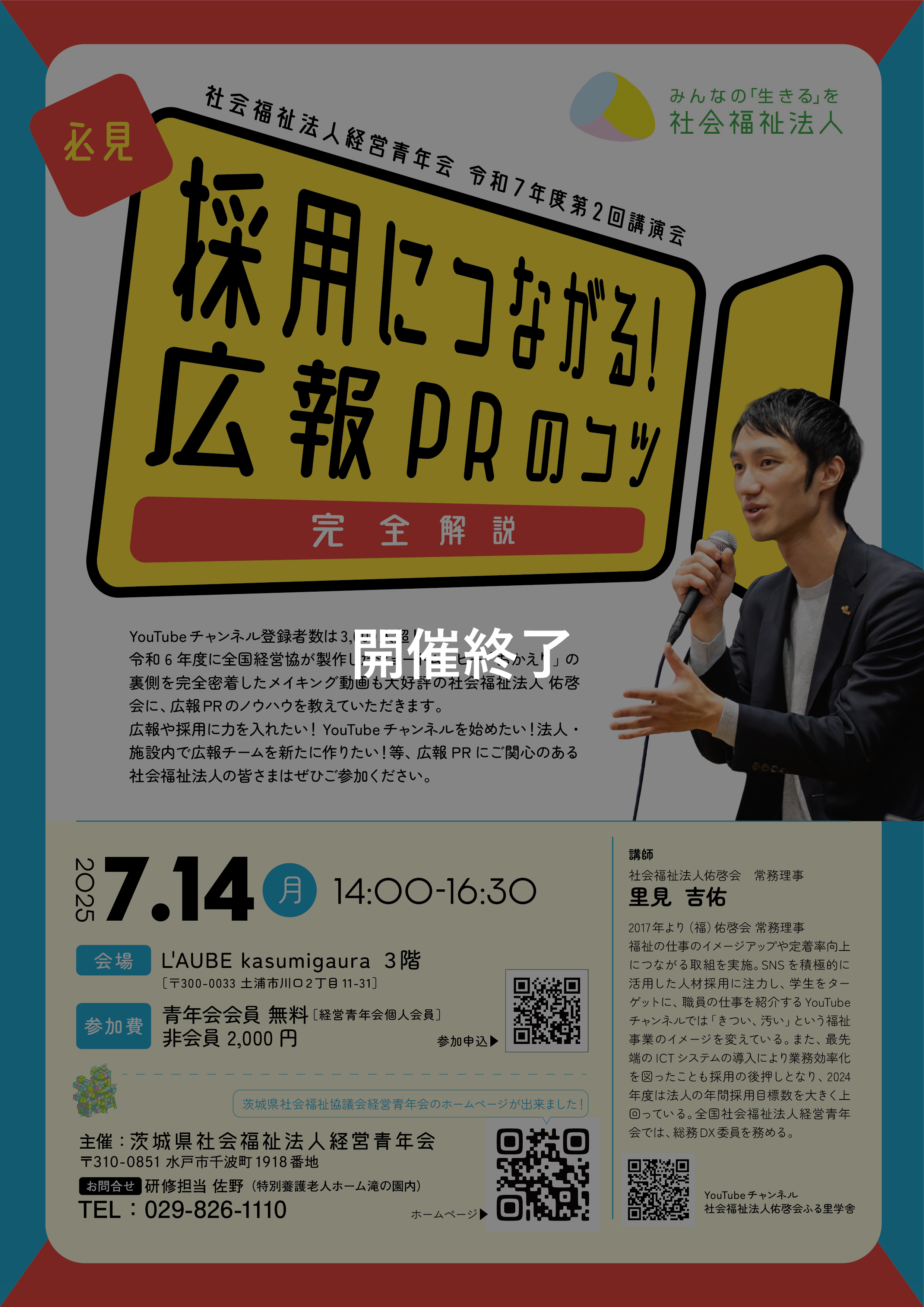 広報や採用に力を入れたい!YouTubeチャンネルを始めたい!法人・施設内で広報チームを新たに作りたい!等、広報PRにご関心のある社会福祉法人の皆さまはぜひご参加ください。